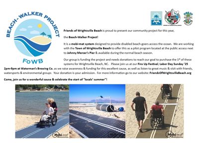 We are actively working with the Town of Wrightsville Beach, Mercer's Pier & Ocean Cure to provide a pilot program for our handicap beach access named "Beach-Walker Project". It's a durable 100' x 6.5' rollable & stowable mat system with a vehicle crossover by Mobi-Mat to allow disabled beach-goers to cross our beach strand & get to the ocean.